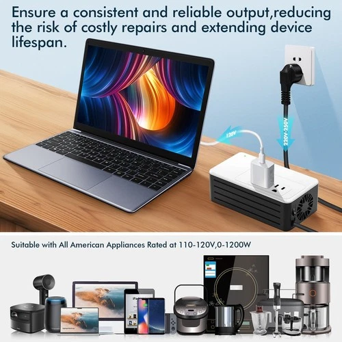1200W voltage converter safely converts 220V to 110V for using American appliances like hair tools, kitchen devices, and electronics during international travel.